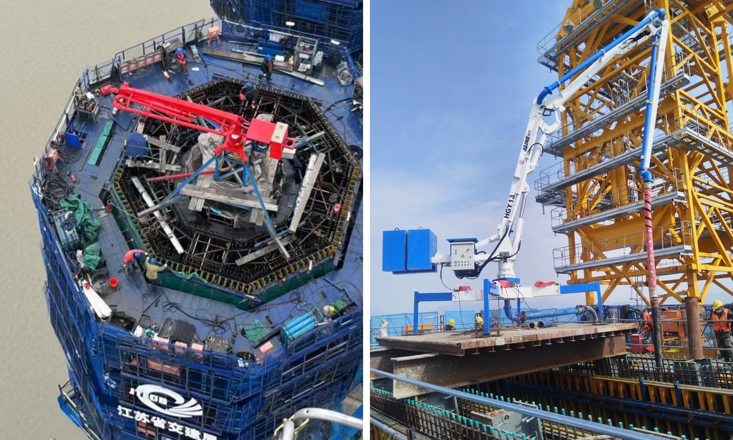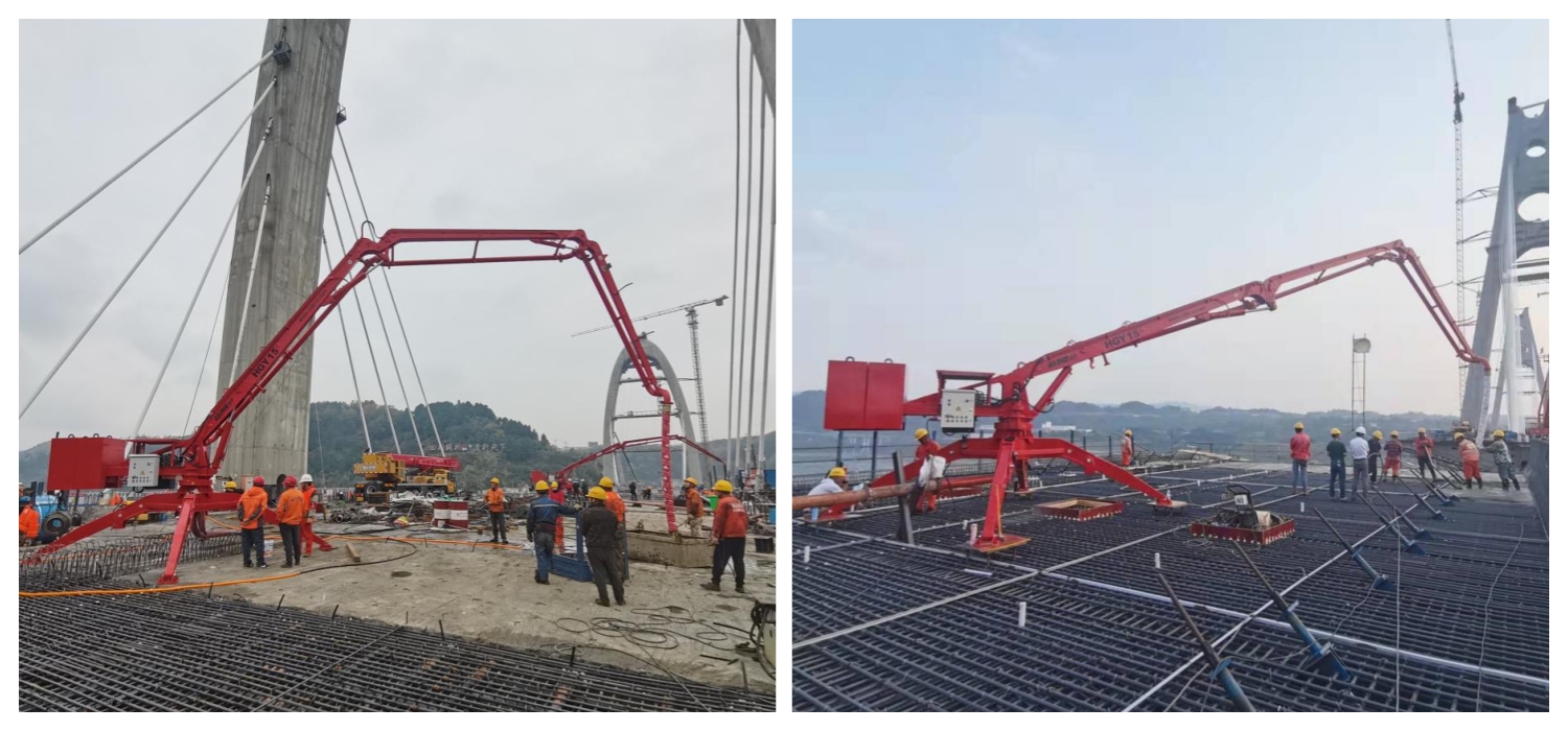 “建研”智能布料機已廣泛應用于橋梁建設的多個關鍵環節,包括錨碇、承臺、預制箱梁、橋面及橋塔等部位的混凝土澆筑。