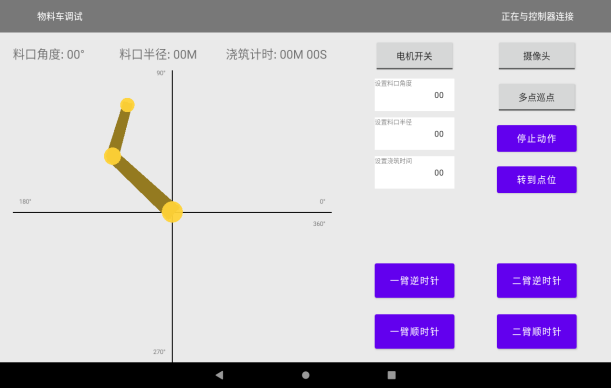 借助APP可實時監測各臂架回轉角度、澆筑半徑、巡點進度、電磁閥狀態及系統報警信息,并實時查看出料口視頻影像,全程可視、可控。